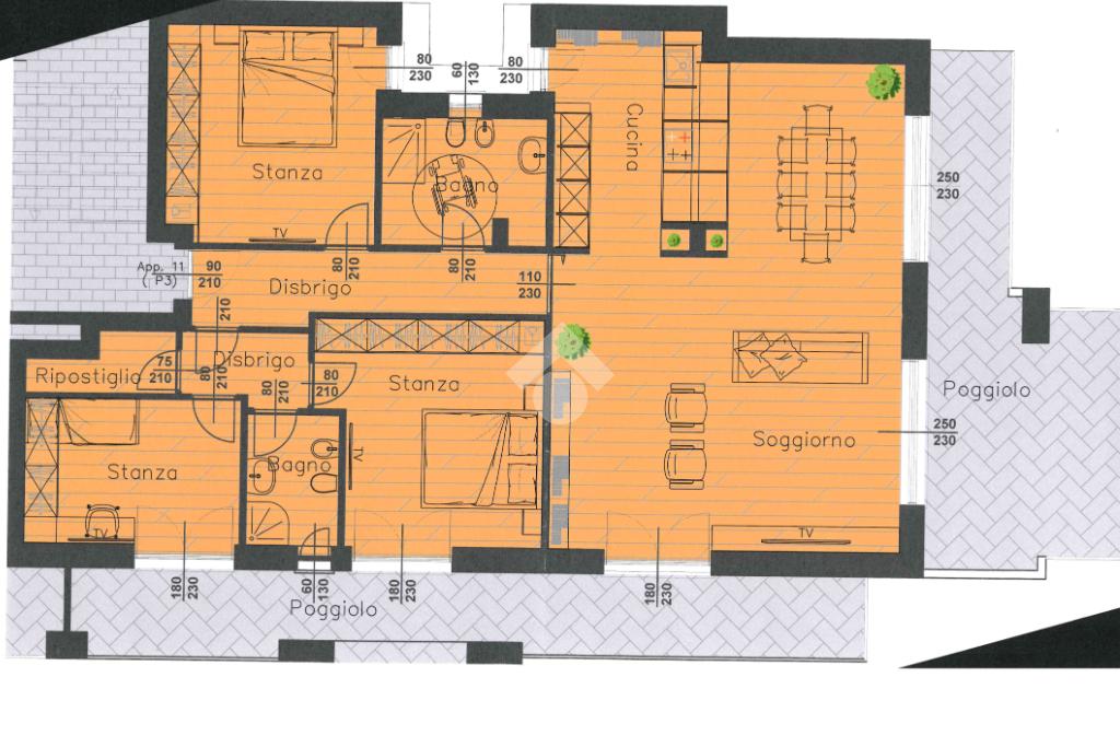 Le tre camere da letto offrono spazio e tranquillità, mentre i due servizi finestrati aggiungono un tocco di funzionalità e comfort.