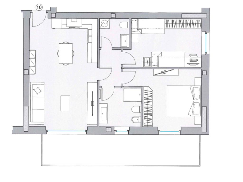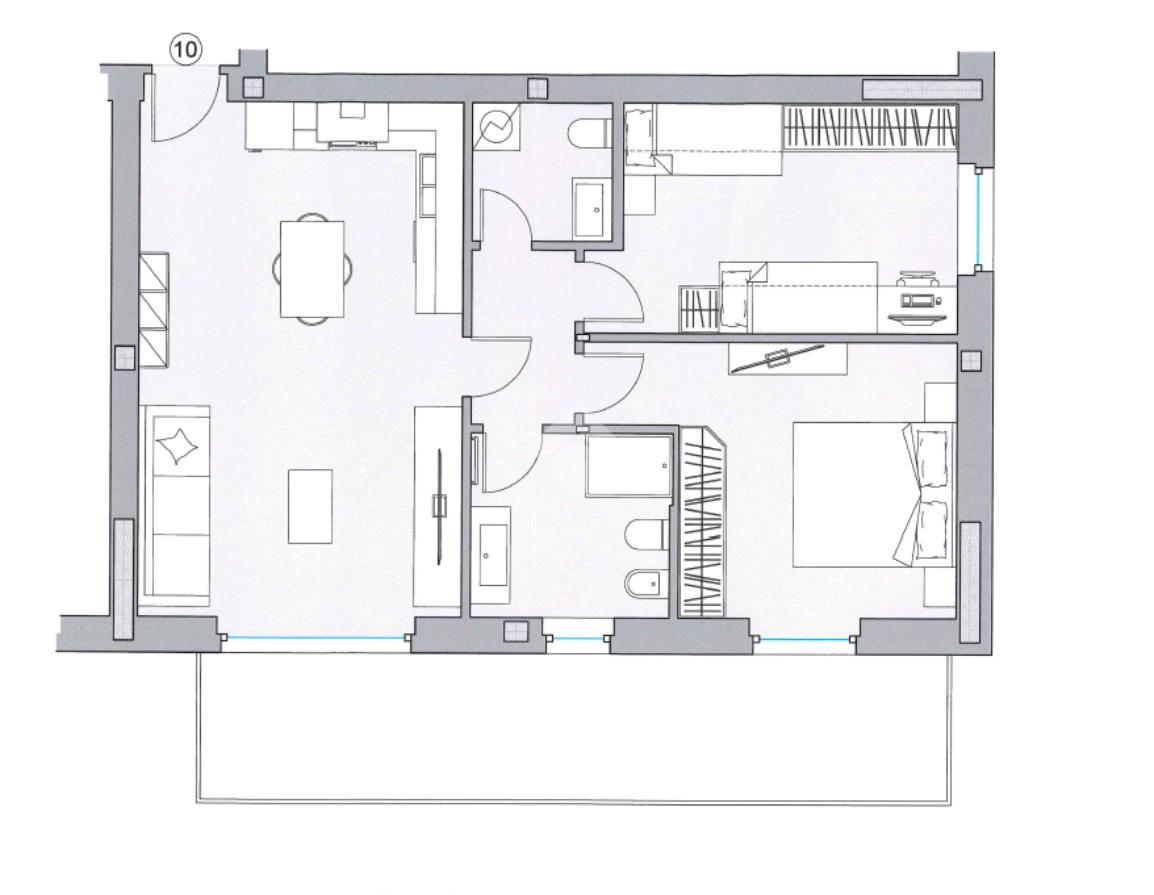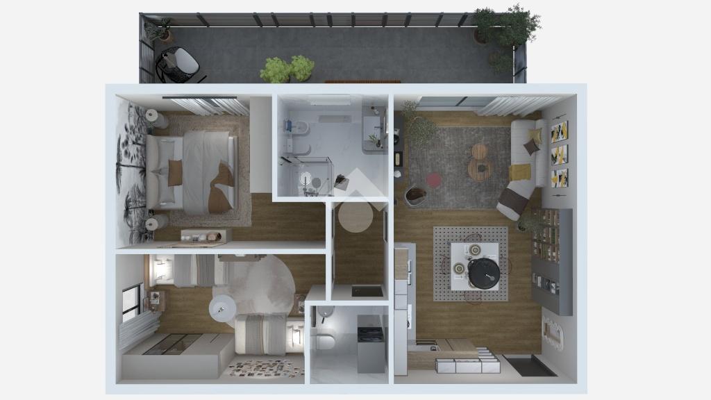 L'appartamento, accessibile anche tramite ascensore, si distingue per un'ottima esposizione alla luce naturale. La zona giorno è concepita in stile open space, ed include uno splendido terrazzino di 24 mq orientato a sud, ideale per godere del sole durante tutto l'arco della giornata ed un comodo bagno. La zona notte si compone di due spaziose camere da letto ed un secondo bagno. A completare la proprietà, garage ed una cantina.